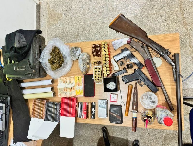 Foram apreendidos um aparelho celular, ferramentas utilizadas na escavação e um frasco com substância semelhante a clonazepam. Os dois foram encaminhados à Unidade Integrada de Segurança Pública (UNISP), onde permanecem à disposição da Justiça.