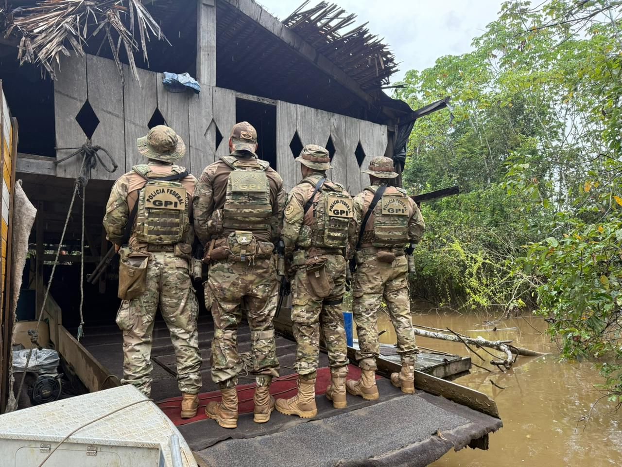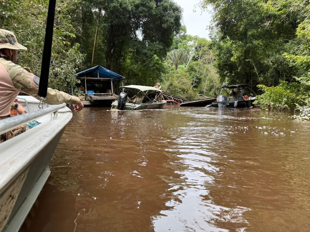 Também foram apreendidos aparelhos celulares em posse dos suspeitos flagrados a bordo, frascos contendo mercúrio — substância altamente tóxica comumente utilizada no processamento ilegal do minério — e um armamento ilegal. Em razão dessa circunstância, dois envolvidos foram presos em flagrante e encaminhados à unidade da Polícia Federal em Rondônia, onde foram adotadas as medidas legais cabíveis.