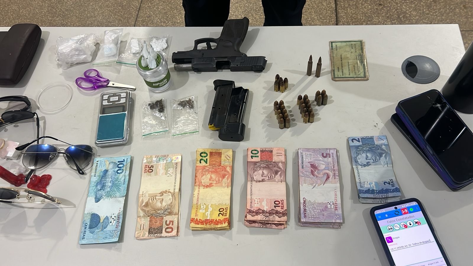 No imóvel indicado do casal foram localizadas duas munições calibre 5.56, 29 munições calibre 9 milímetros, além de R$ 1.018,00 em dinheiro, seis aparelhos celulares, óculos de sol, relógios e bijuterias.