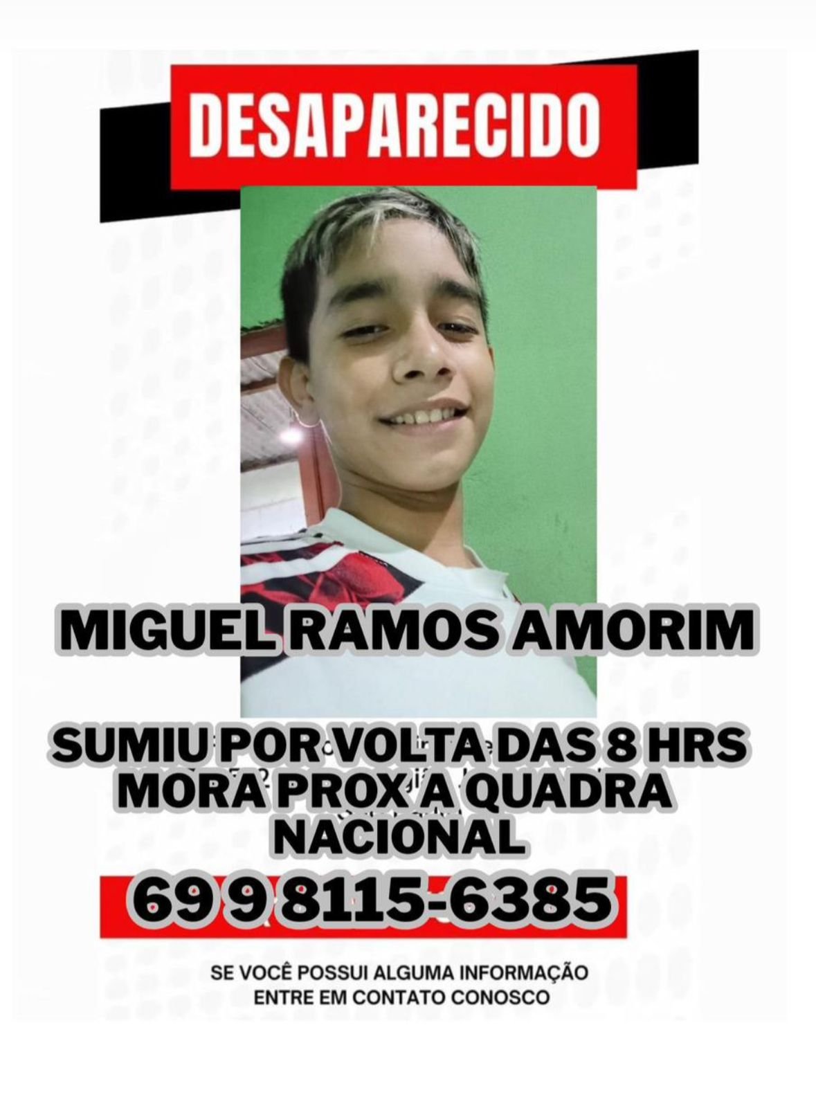 Miguel teria sido visto pela última vez nas proximidades da quadra do bairro Nacional. Qualquer informação que possa ajudar a localizar a criança pode ser repassada diretamente à mãe pelo telefone (69) 98115-6385.