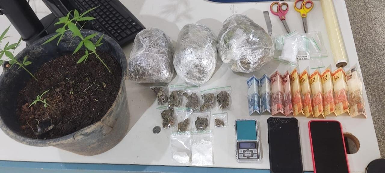 Com o apoio de outra guarnição, os policiais realizaram buscas na casa e encontraram cerca de 10,8 gramas de entorpecentes, uma balança de precisão, dinheiro em espécie, diversos objetos pessoais e um simulacro de pistola.