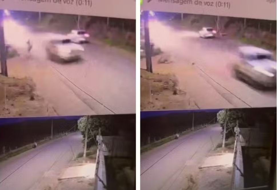 Imagens de uma câmera de monitoramento registraram o momento em que a vítima caminhava às margens da rodovia e foi atingida pelo carro, sendo arremessada para fora da pista.