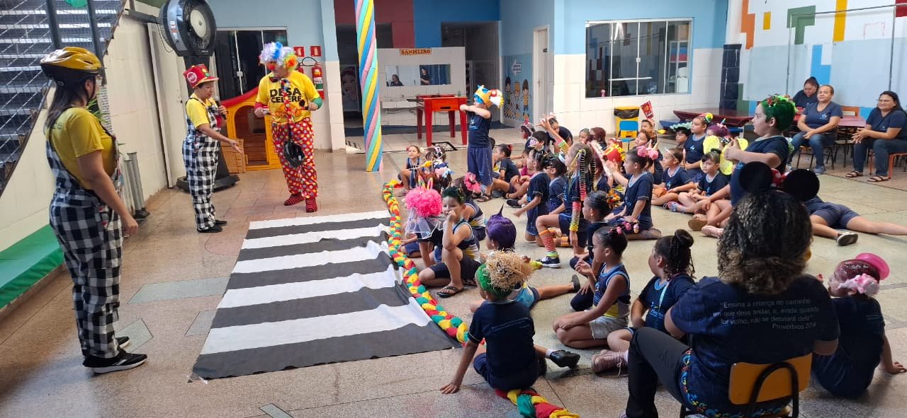 Um dos momentos mais aguardados foi a apresentação do palhaço Amarelão e da interlocutora Rosinha, personagens que encantaram os pequenos com humor e música. Com linguagem leve e divertida, eles ensinaram como atravessar a rua com segurança e respeitar as regras do trânsito.