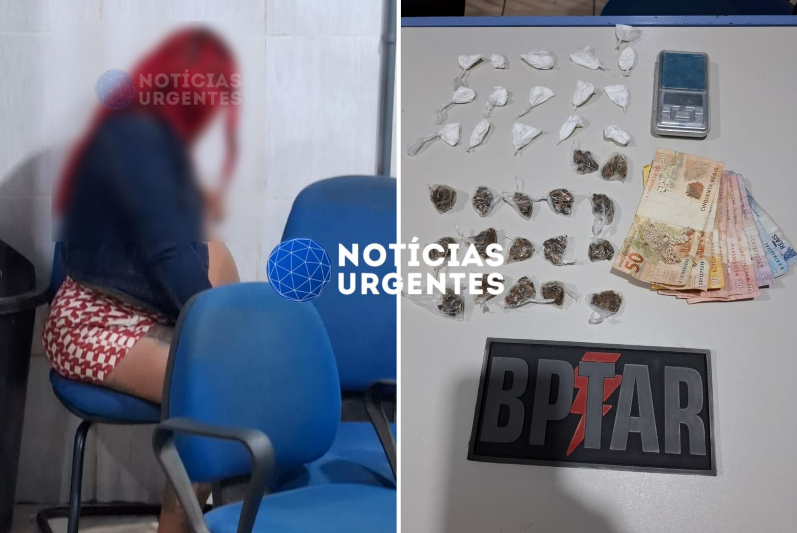 De acordo com informações apuradas pela equipe do Notícias Urgentes, a mulher, de 26 anos, estava acompanhada de seu companheiro, um adolescente de 15 anos, quando foi abordada pelos policiais. Durante a revista, foram encontradas porções de maconha e cocaína, além de uma balança de precisão e dinheiro trocado, indicando a prática de comercialização de entorpecentes.