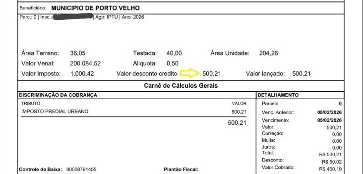 Até o dia 5 de fevereiro de 2026, os contribuintes de Porto Velho podem obter 10% de desconto no pagamento em cota única do Imposto Predial e Territorial Urbano (IPTU) e da Taxa de Resíduos Sólidos Domiciliar (TRSD). A Prefeitura de Porto Velho, por meio da Secretaria Municipal de Economia (Semec), orienta a população a ficar atenta ao prazo para garantir o benefício.