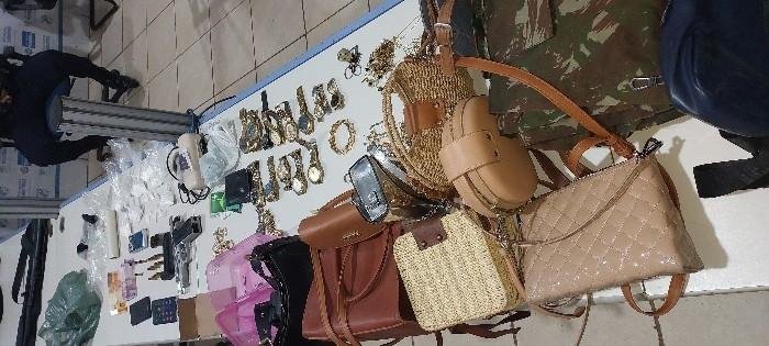 - Diversos objetos de procedência duvidosa, incluindo bolsas femininas, joias, relógios, aparelhos eletrônicos e outros itens.