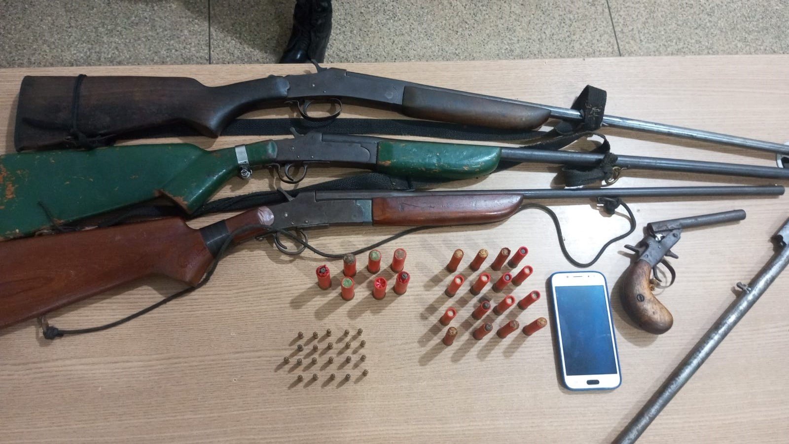 Policiais militares do 6º BPM, lotados na 3ª Companhia em Nova Mamoré, apreenderam quatro armas de fogo e diversas munições após atenderem a uma denúncia de restrição de liberdade no âmbito familiar, na zona rural do município.